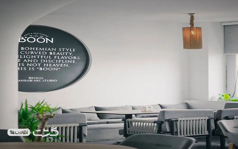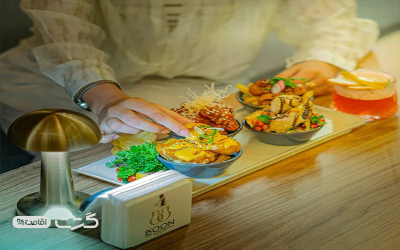 منوی رستوران بوون کیش شامل غذاهای سنتی و محلی ایرانی به همراه غذاهای بینالمللی مانند دریایی، استیک و پیتزا میباشد. ساعات کاری این رستوران از ساعت 13 بعد از ظهر تا 1 نیمه شب میباشد و میهمانان گرامی میتوانند در این محدوده زمانی برای ناهار و شام به این رستوران مراجعه نمایند.